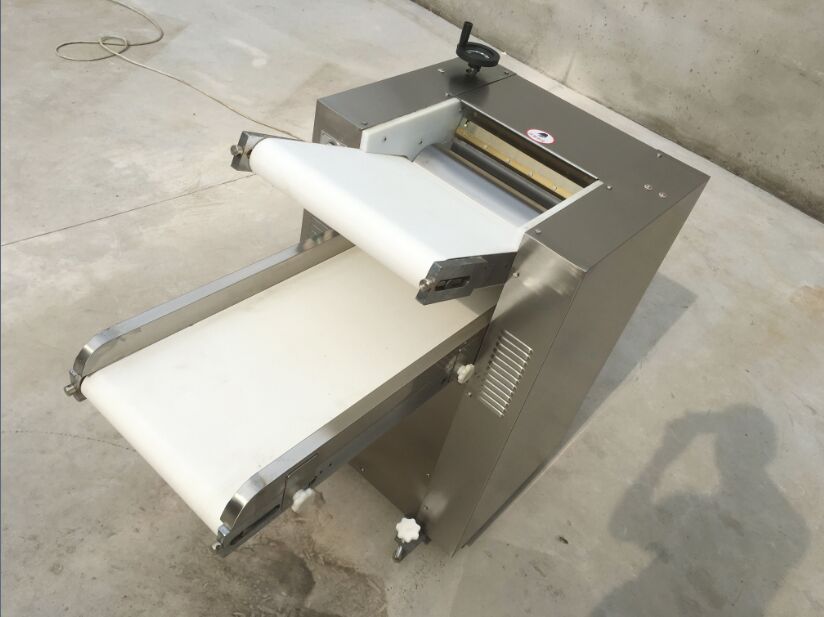 2.2工作原理:将定量面团放在下输送带上,开动机器,自动输送到轧辊间,面团在输送带和轧辊作用下自动完成喂入和压面工程。压完后经上输送带自动传倒下输送带,由于采用不同线速度,使面皮自动完成折叠和输送、喂入,转下道工序。经过反复揉压达到理想压面效果。轧辊间隙调整是通过一涡轮副和偏心机构实现厚薄无级可调,用户可根据实际情况及面食工艺自行掌握。